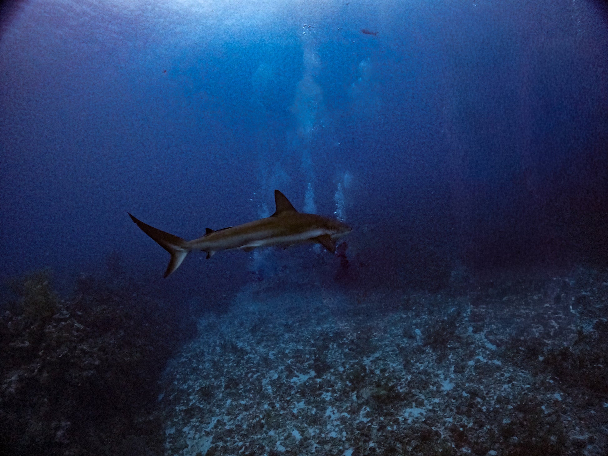 A sleek reef shark glides effortlessly through the blue abyss, its silhouette cutting across a quiet underwater world. The faint trail of divers’ bubbles rises behind it a reminder of our fleeting presence in its vast domain. Captured in the stillness of Roatán’s deep reef, this image embodies grace, power, and the raw beauty of the ocean’s untamed rhythm.